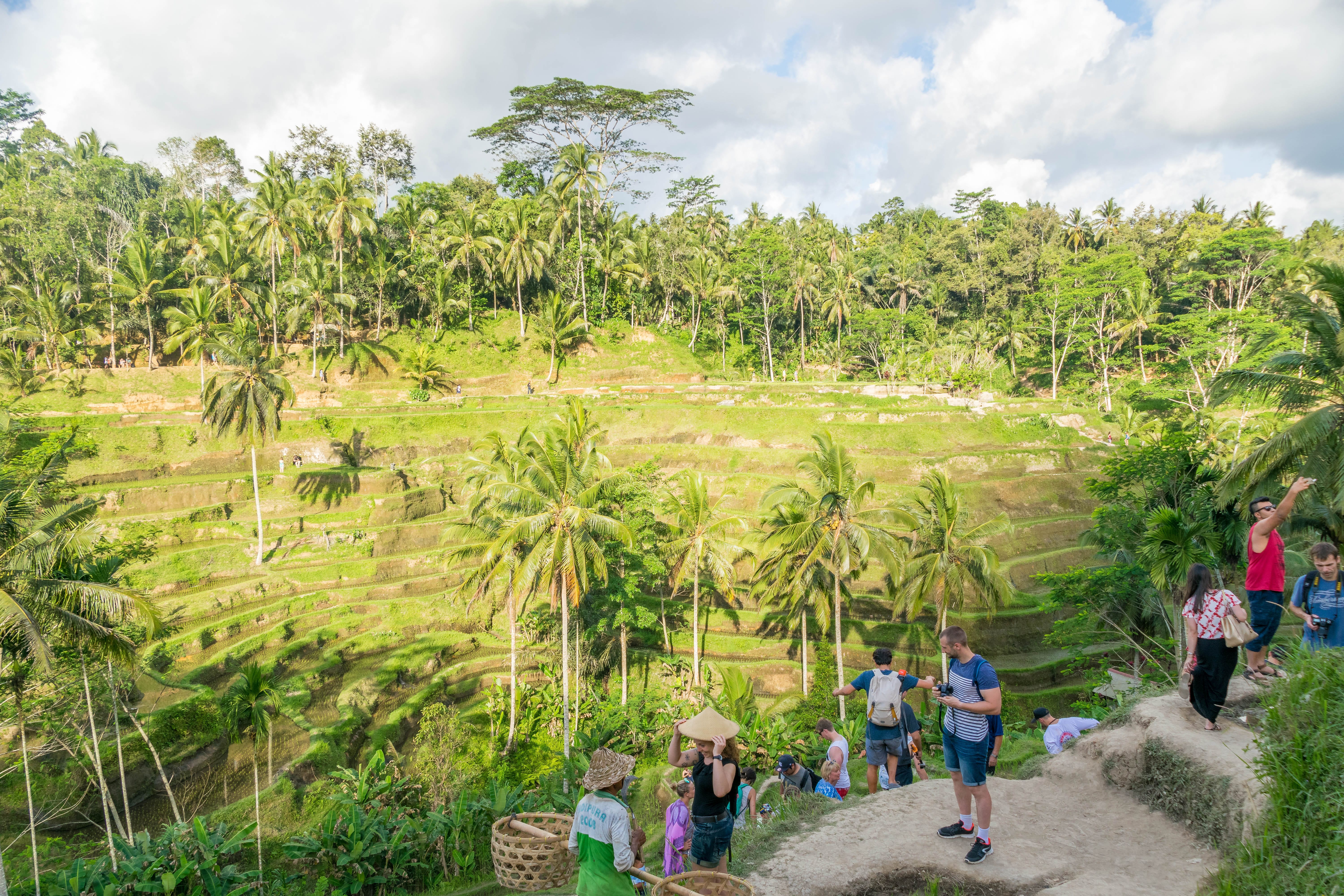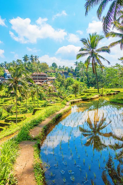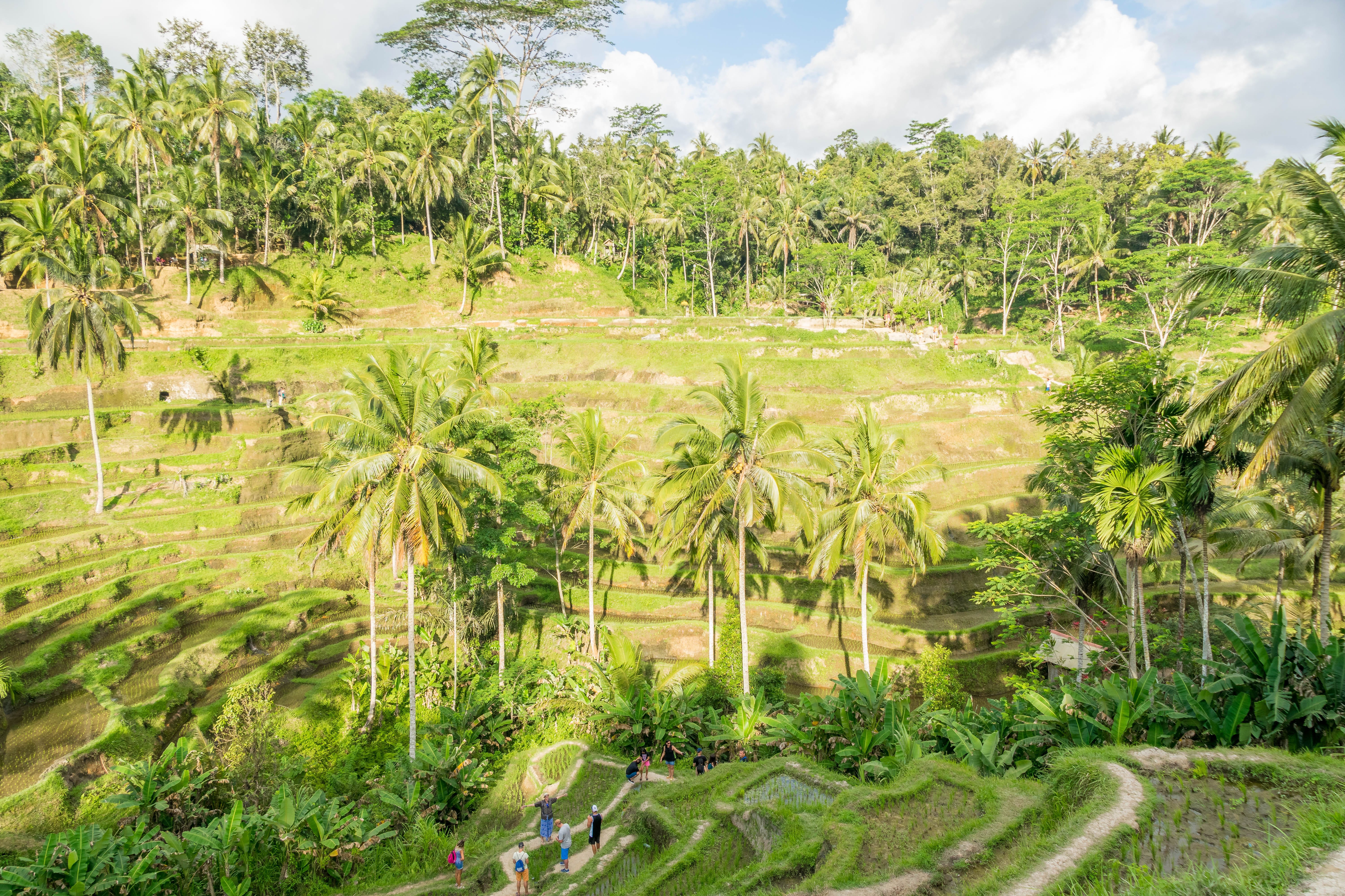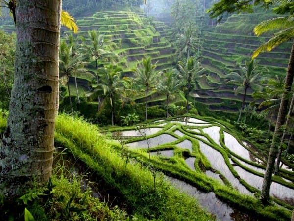 Os campos de arroz são uma obras de arte,e o mais bonitos é o de Tegalalang, que fica cerca de 15 à 20 minutos do centro de Ubud. Os campos têm vários tons de verde e são extremamente bem cuidados. Os coqueiros ainda deixam a paisagem mais bonita.