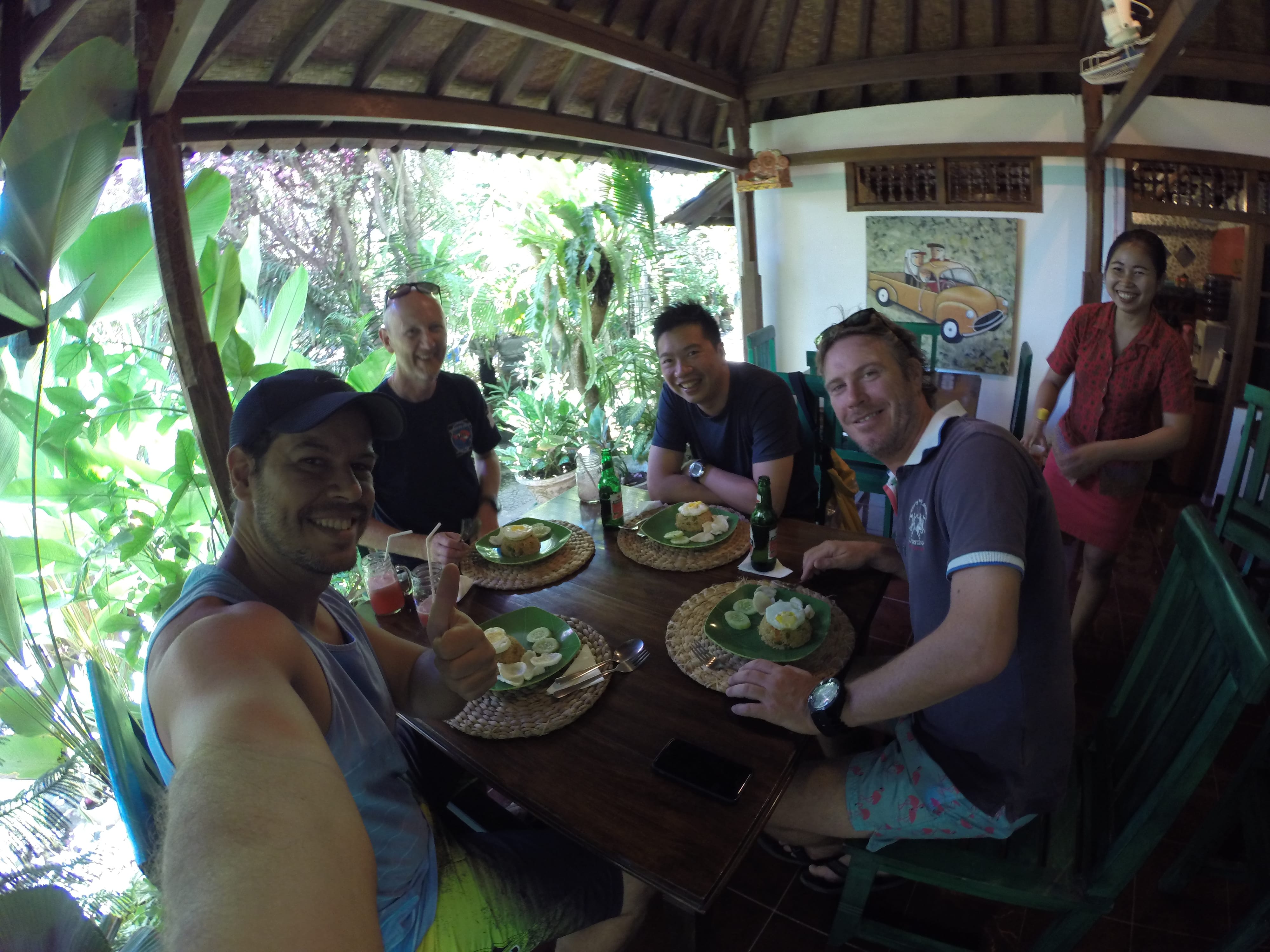 Depois voltamos para praia e fizemos uns 40 minutos de tempo de superfície. Fomos recebidos pelo staff da operadora com um café da manhã, servido de panquecas de banana, suco fresco de melancia e manga, chá gelado ou quente. O grupo aproveitou muito bem o café da manhã. Logo começamos a nos equipar novamente para o segundo mergulho. No segundo mergulho já tínhamos a companhia de mais uns 15 mergulhadores de outras operadoras que haviam chegado a praia.