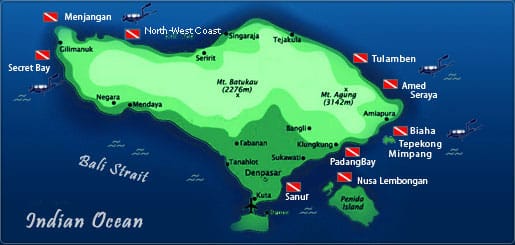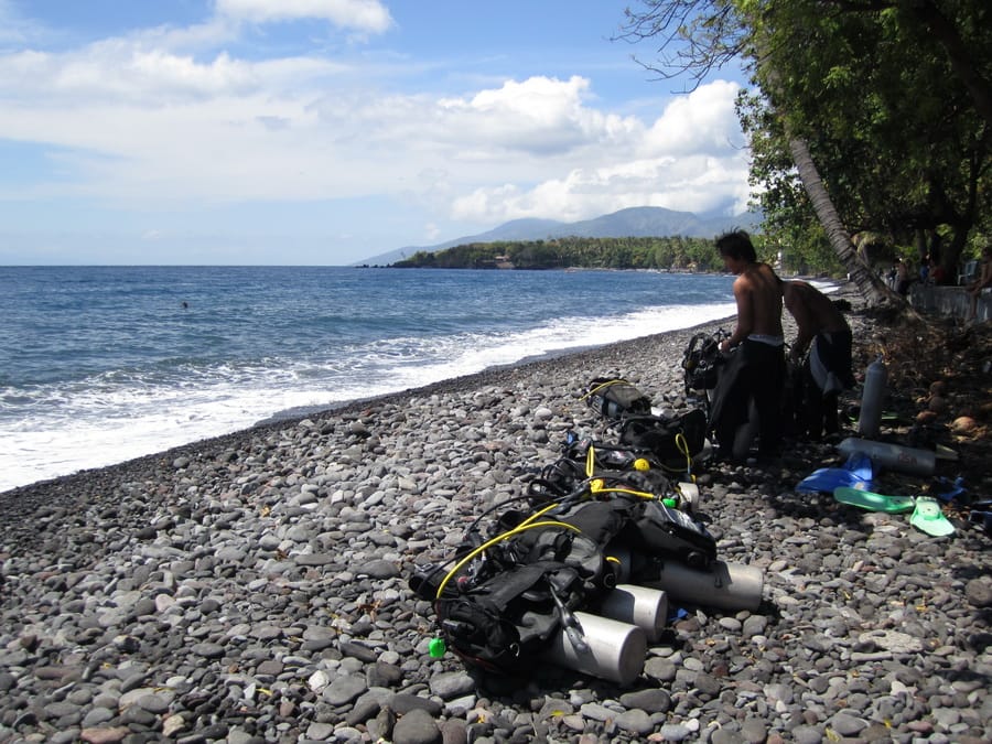 Devido a presença do Vulcão Agung (Monte Agung), o fundo do mar é formado por pedras vulcânicas lisas, arredondadas e negras; a água é quente (28º) e transparente; a vida marinha é vasta (de minúsculos cavalos marinhos pigmeus de menos de 1 cm até grandes Mola-molas de quase 2 metros); o relevo geográfico também colabora de forma fantástica: um abismo se abre a apenas alguns metros da praia. Ou seja, temos um verdadeiro paraíso para nós mergulhadores.
