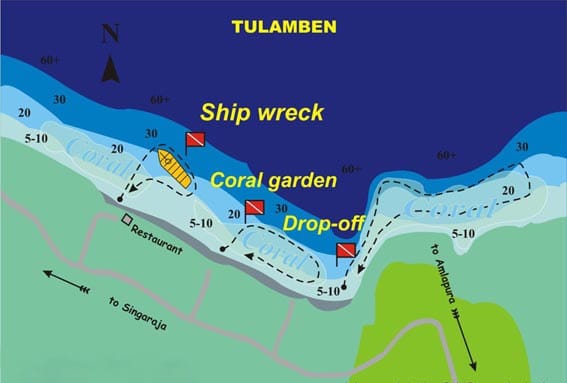 Em Tulamben há três pontos de mergulho: USAT Liberty Glo, Koral Garden e Drop off. Todos os mergulhos são Shore dives (estão acessíveis da terra), o que torna tudo bem mais barato. Uma simples caminhada leva você diretamente a eles. Os dive masters (em sua maioria) são locais e sabem exatamente onde estão as melhores coisas para se ver.
