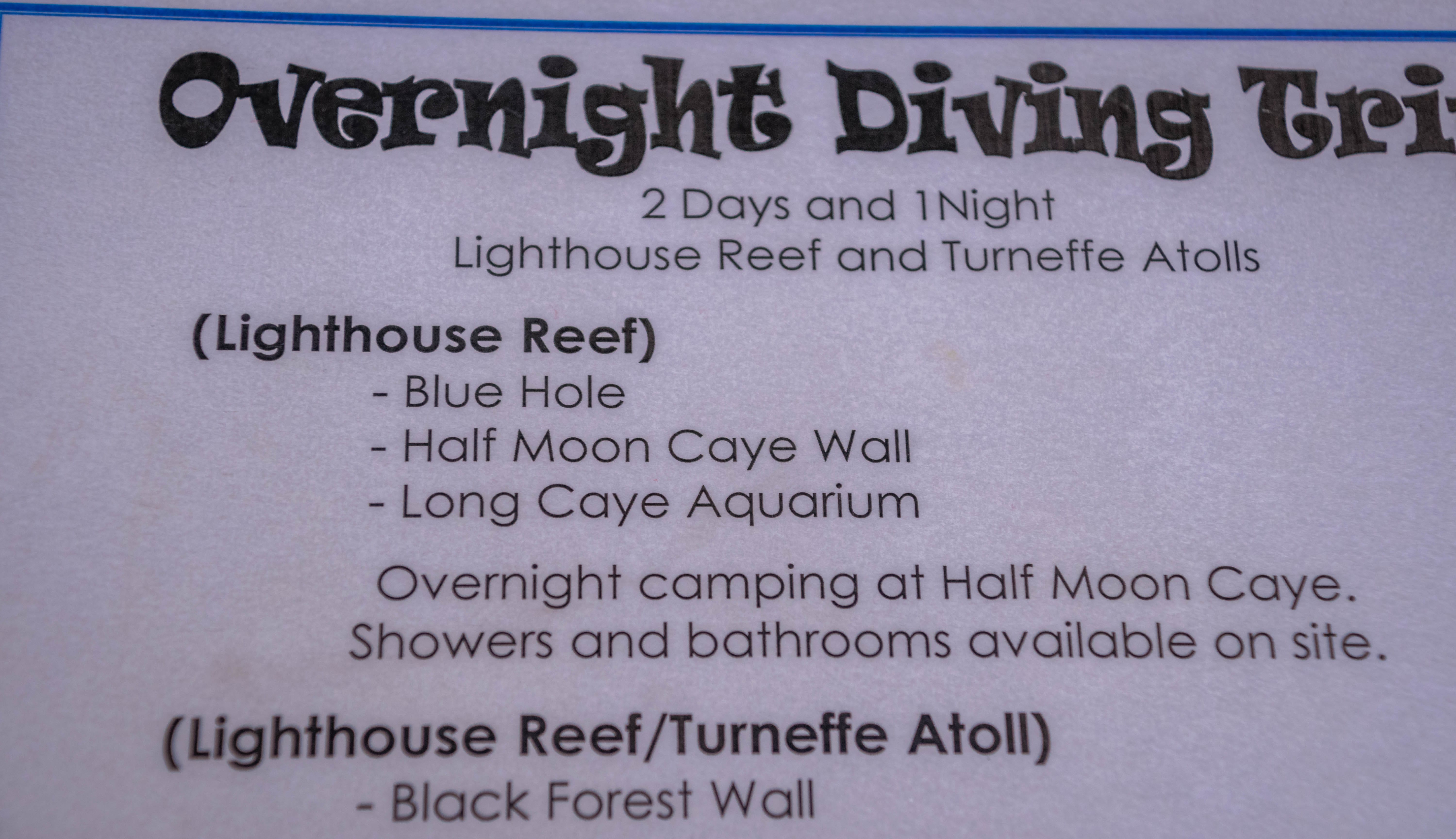 Se você é mergulhador certificado, não deixe de aproveitar a oportunidade para conhecer o Lighthouse Reef. Um dia preenchido com três mergulhos a partir de Caye Caulker, incluindo um no famoso Blue Hole, outro nas paredes do Half Moon Caye e o último no Long Caye custa 165 USD, sendo o centro de mergulho Frenchie’s Diving o mais recomendado, adoramos a serviço prestado. Eu fiz reserva para mergulhar no Blue Hole pelo site da operdora, isso é essencial pra garantir a sua vaga. Minha esposa me acompanhou e fez snorkelling em todos os pontos, inclusive no Blue Hole.