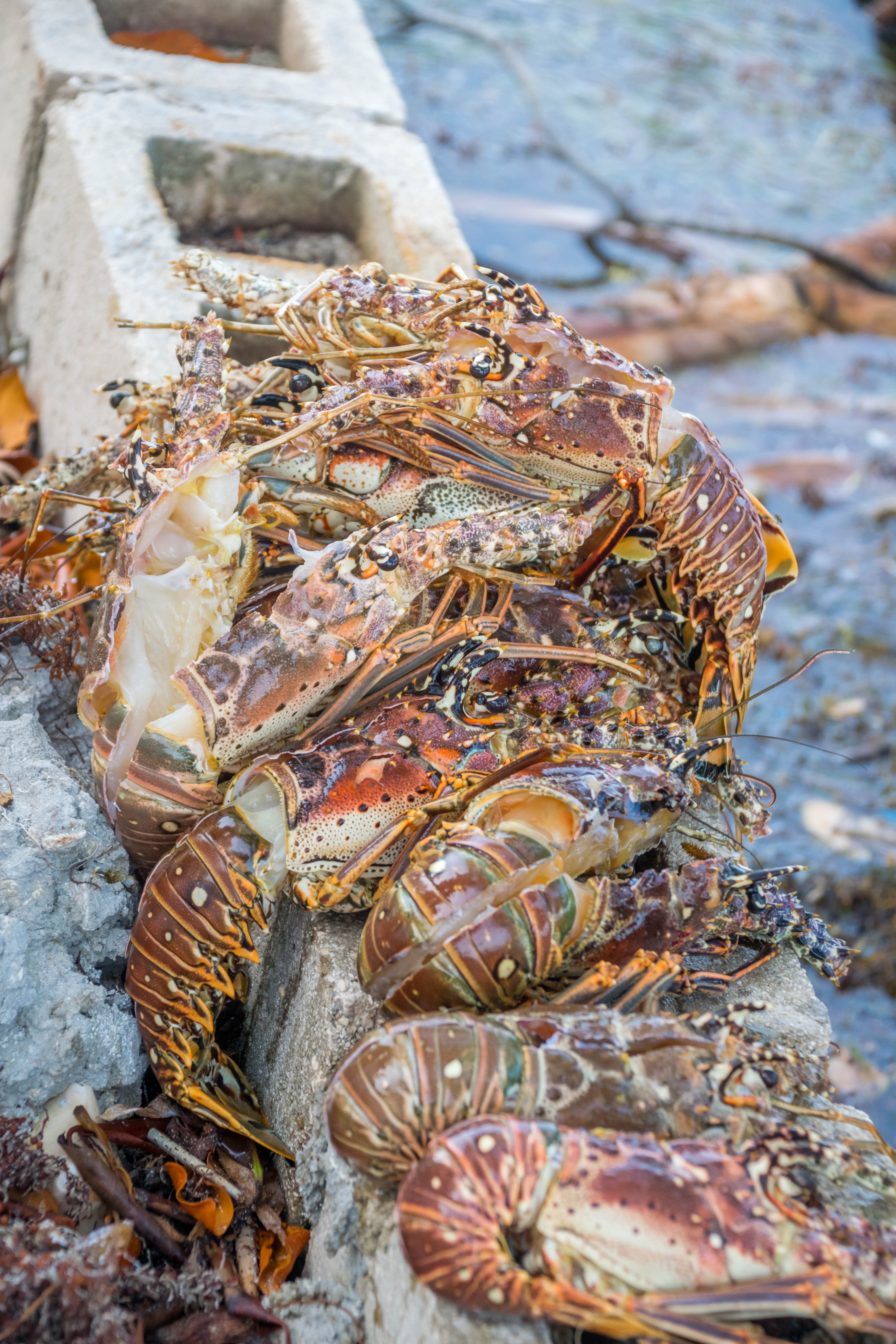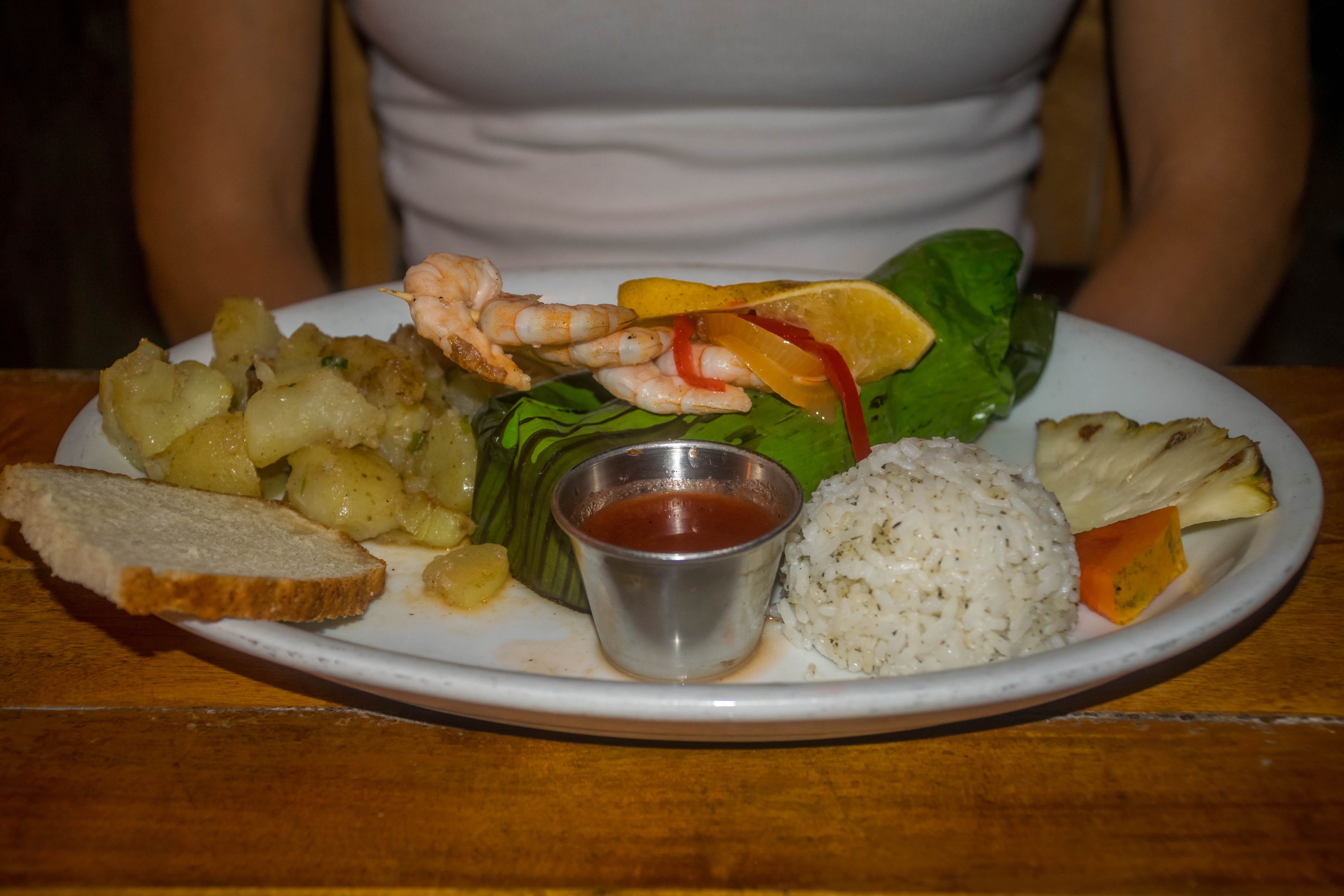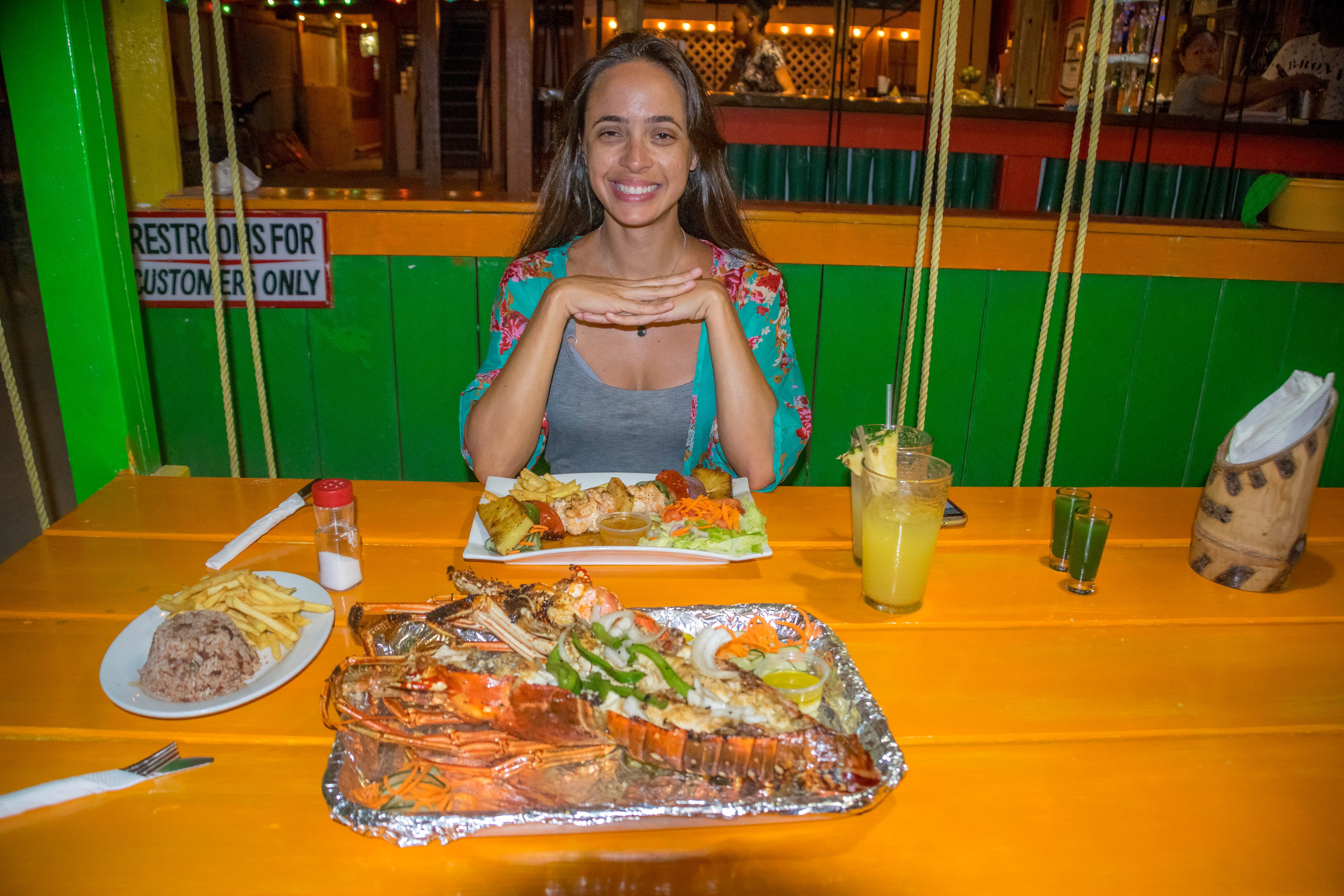 Um outro restaurante que nós aprovamos foi o Brisas Del Mar, estávamos retornando do passeio de barco no meio tarde. Quando bem em frente ao restaurante eu vi os pescadores limpando as lagostas recém pescadas. Eles me disseram que as lagostas eram para o restaurante Brisas Del Mar, na hora eu escolhi a minha e já pedi no restaurante para preparar na brasa com azeite e alho. Geórgia escolheu posta de atum.