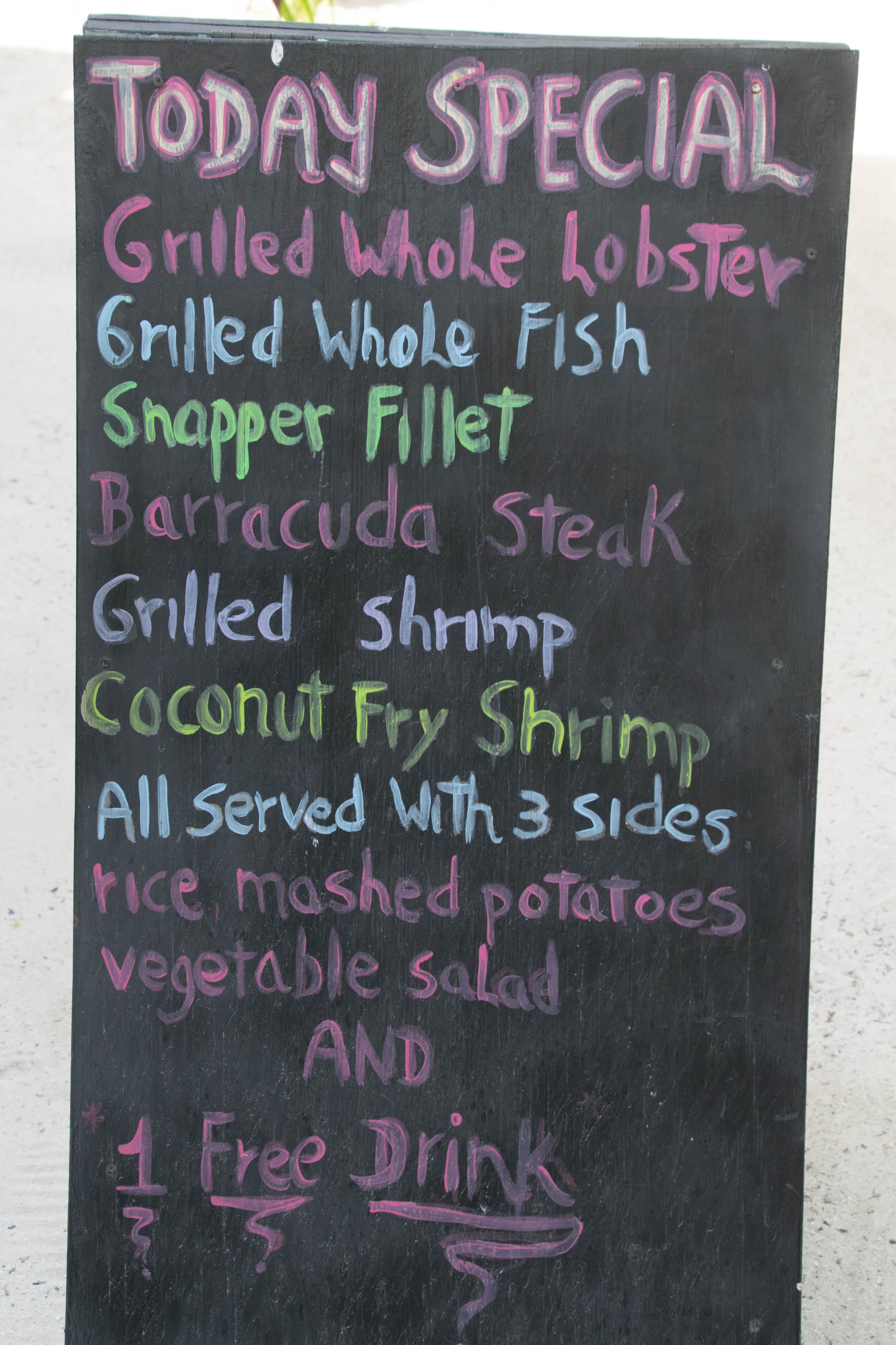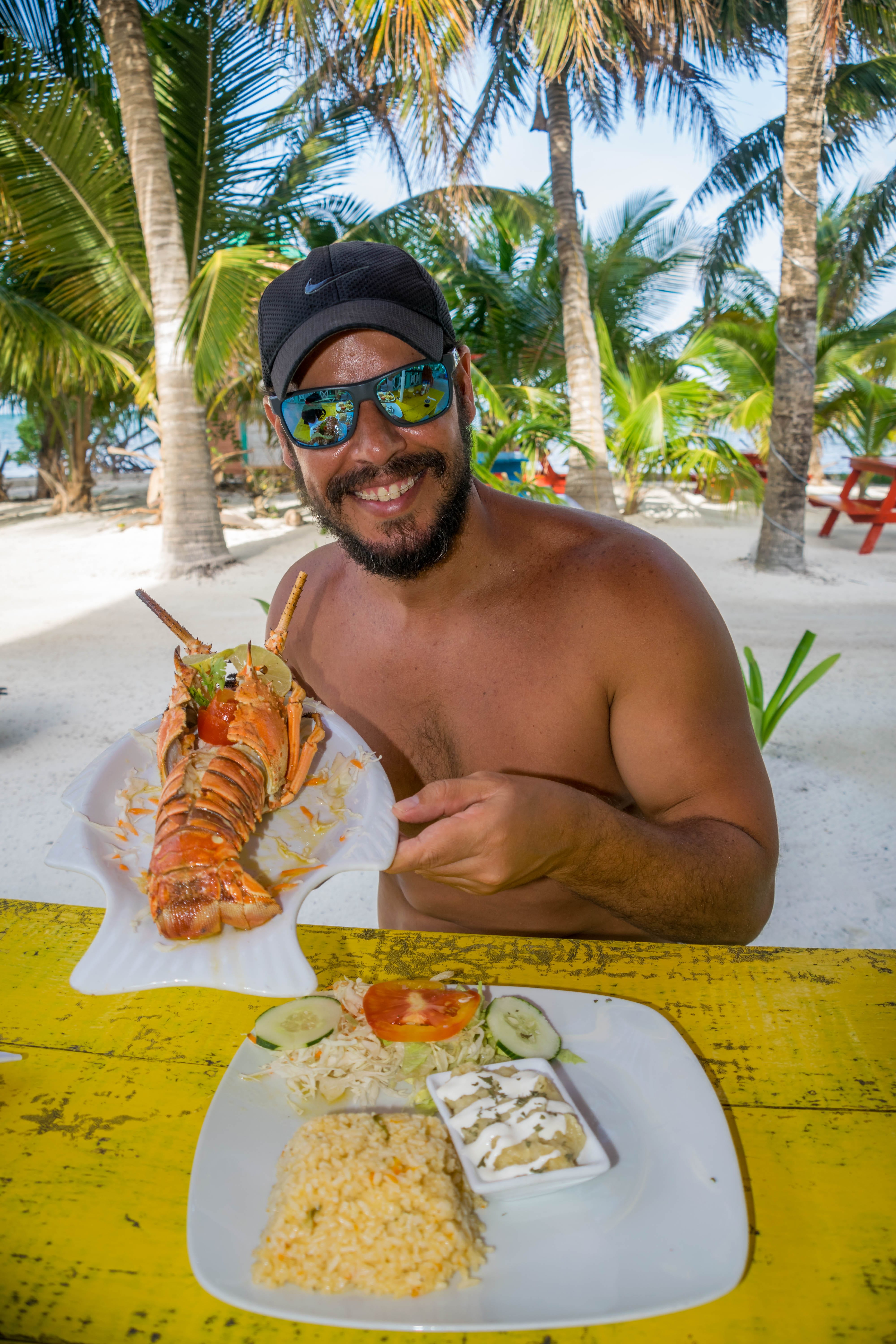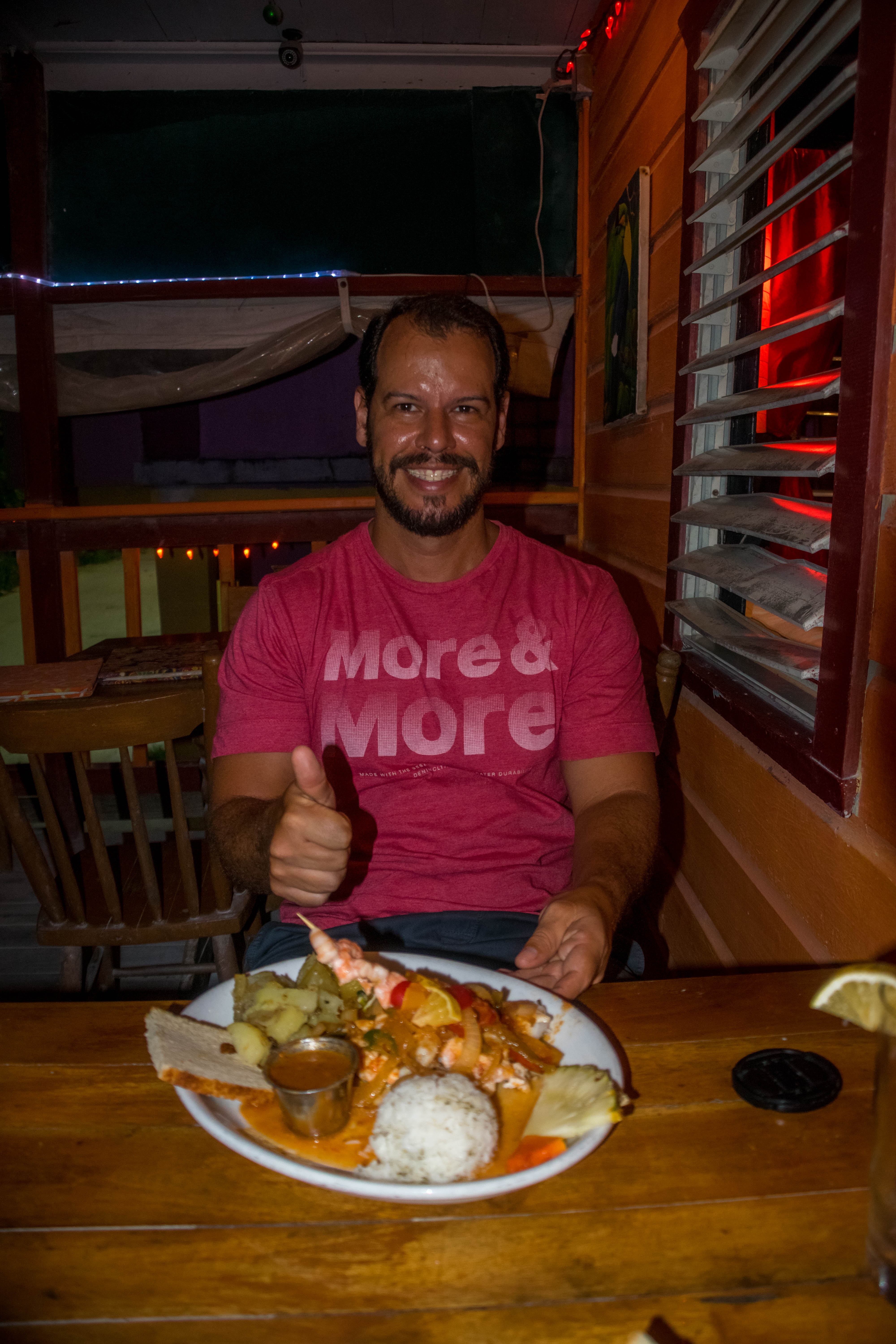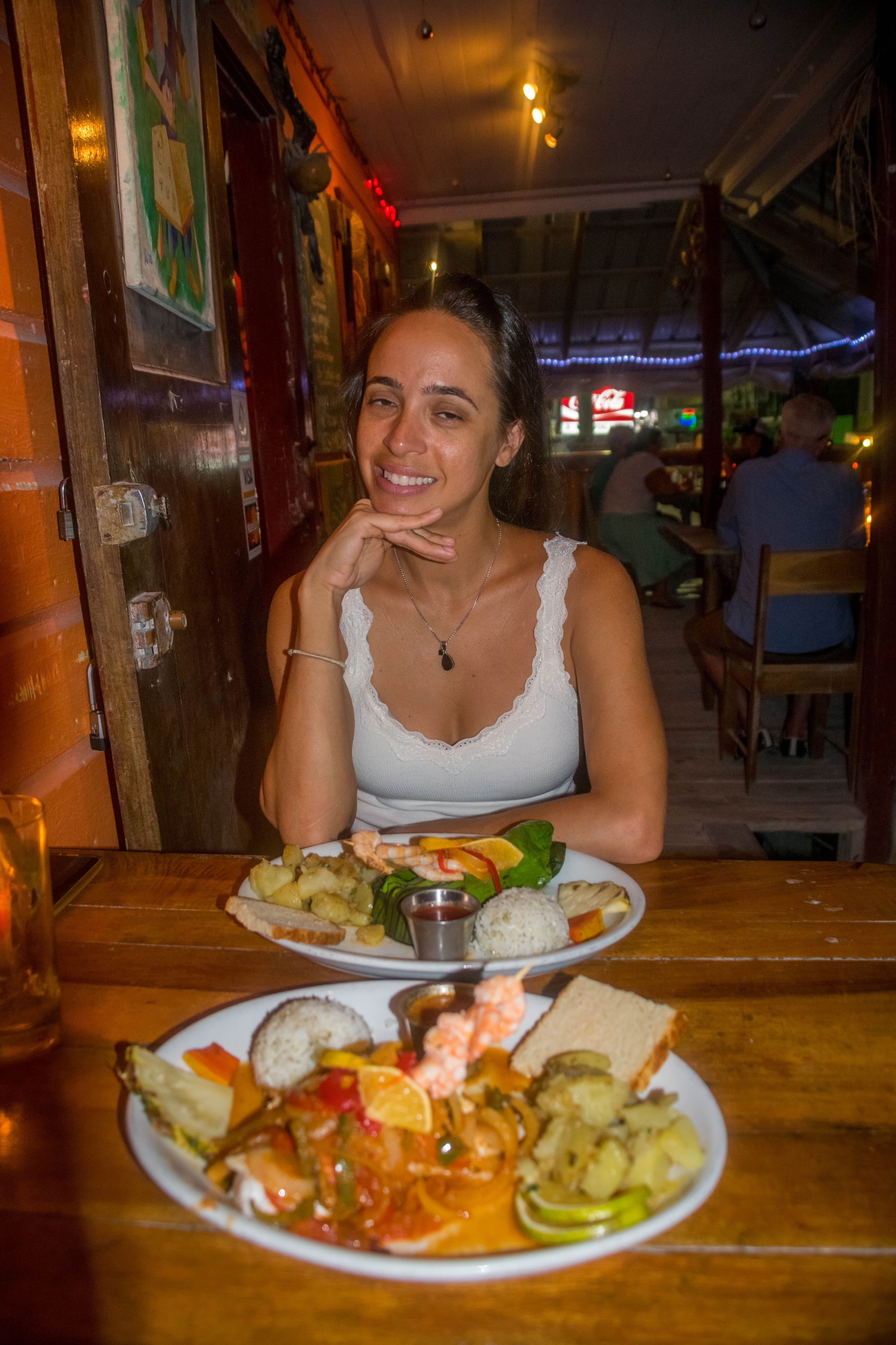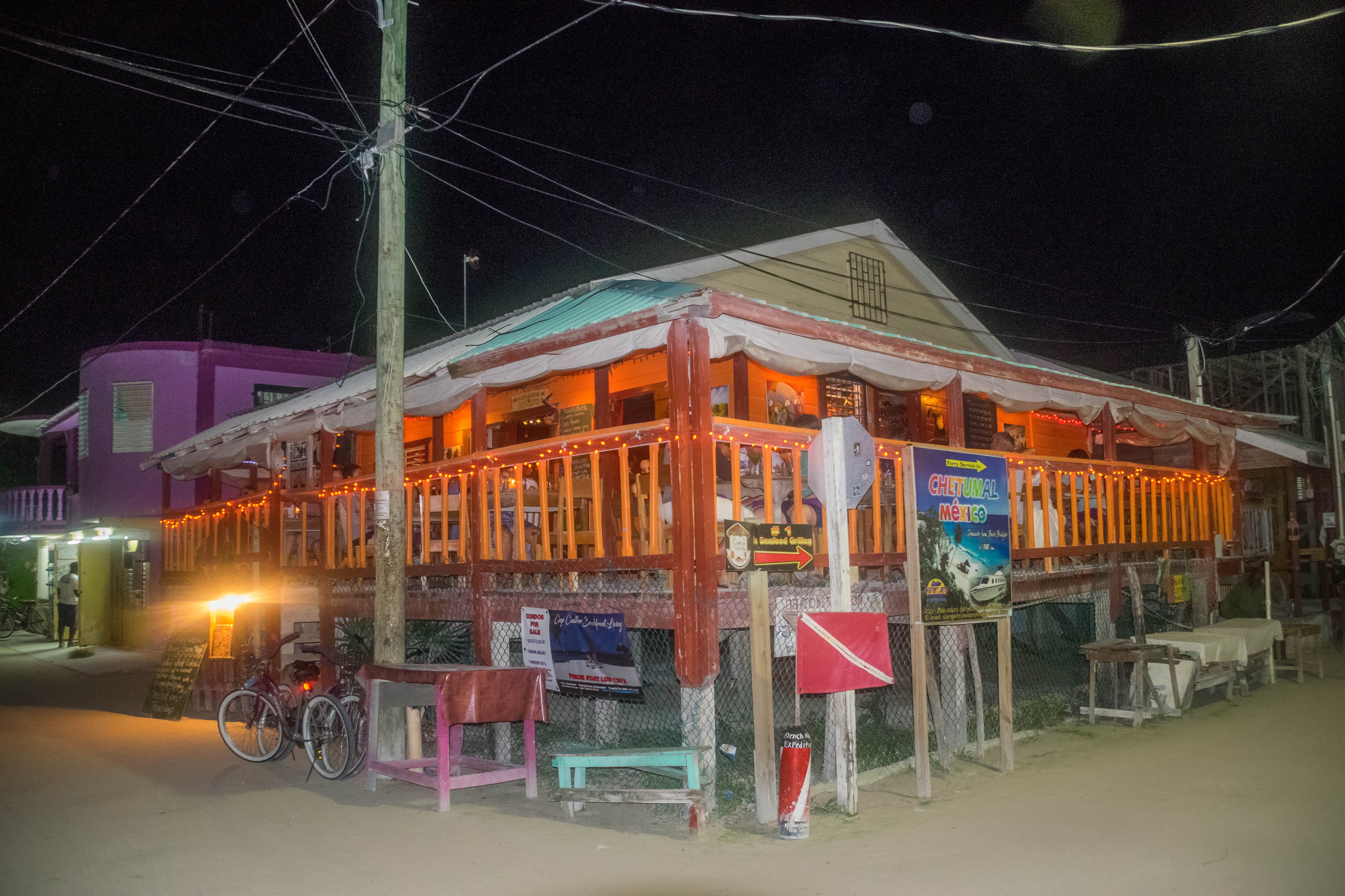 Bem mais simples mas igualmente delicioso, o peixe do dia ou camarões grelhados na brasa em plena rua pelo cozinheiro local “Jolly Roger” é absolutamente recomendável (25 Bz, incluindo 3 rum puch e uma pequena sobremesa).