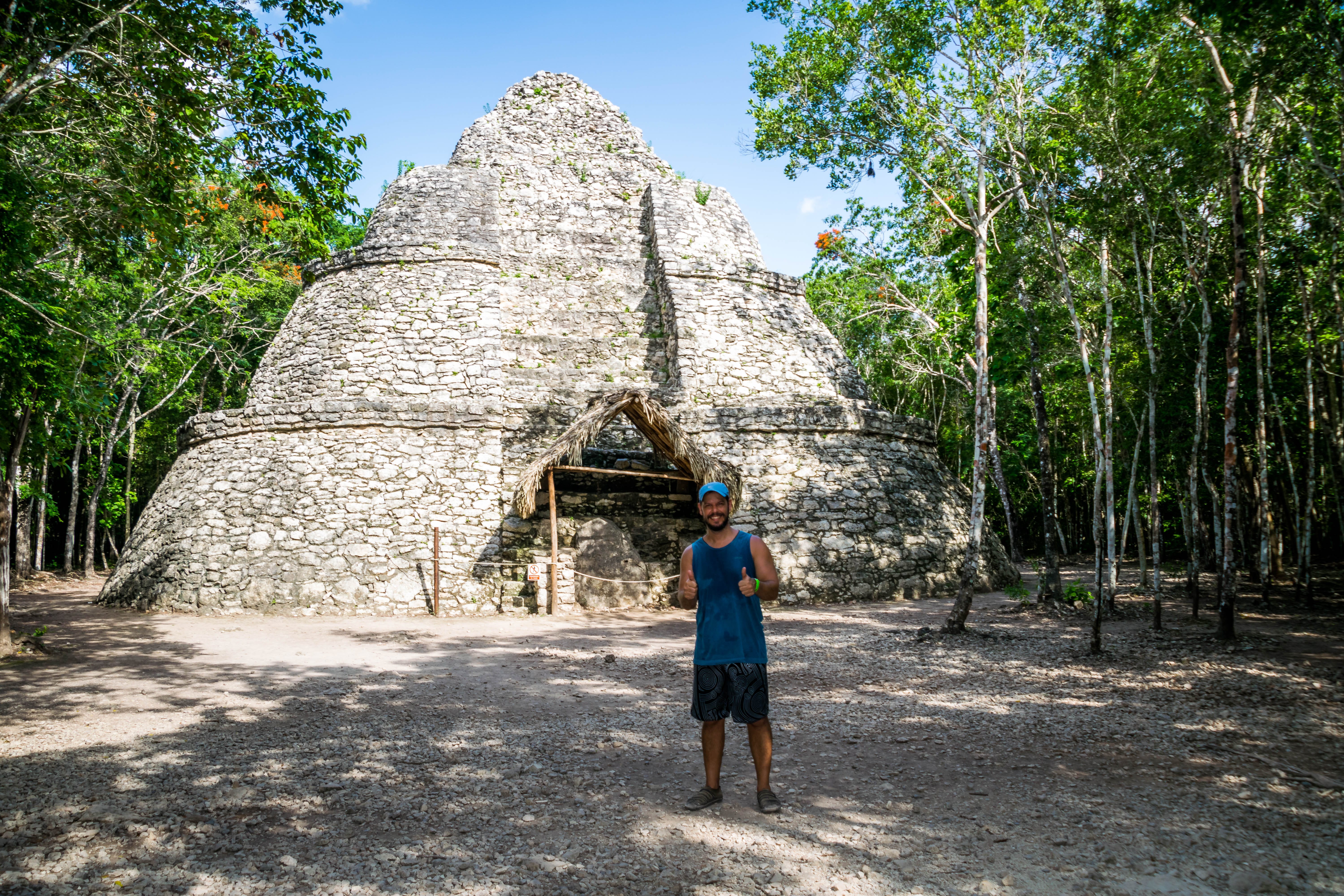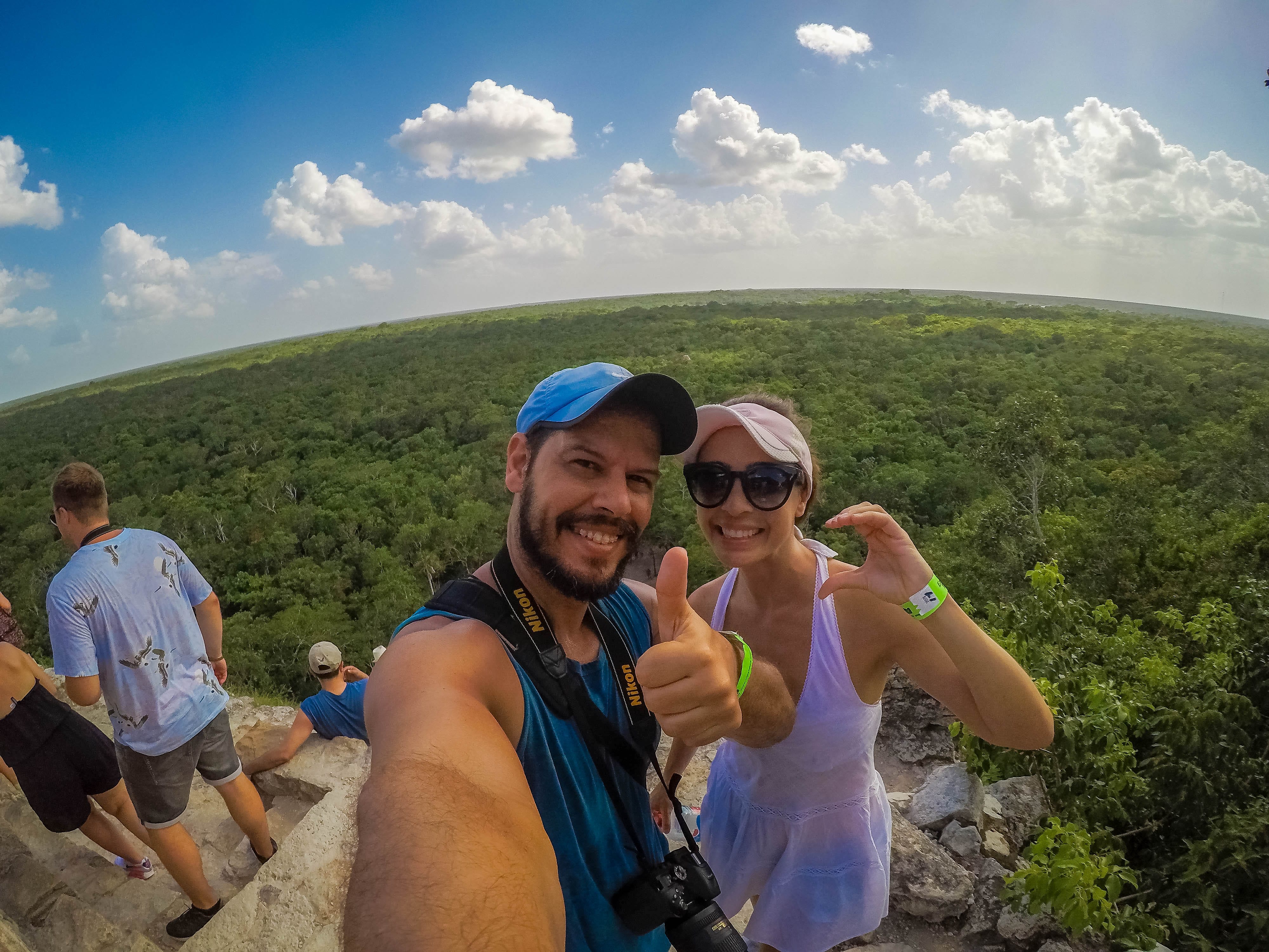 Cobá significa “água abundante” e o sítio arqueológico está localizado entre duas lagoas  cercadas por uma selva exuberante.  O local possui umas das maiores pirâmides do México (Nohoch Mull) que pode ser escalada. Nós subimos e a vista da selva lá de cima é espetacular! A Pirâmide é bem alta possui 42 metros de altura e são 129 degraus até o topo. Mas é tranquila a subida e ainda tem uma corda de segurança para auxiliar. A cidade data da era pré-colombiana maia. A maior parte foi construída entre os anos 500 e 900 depois de Cristo.