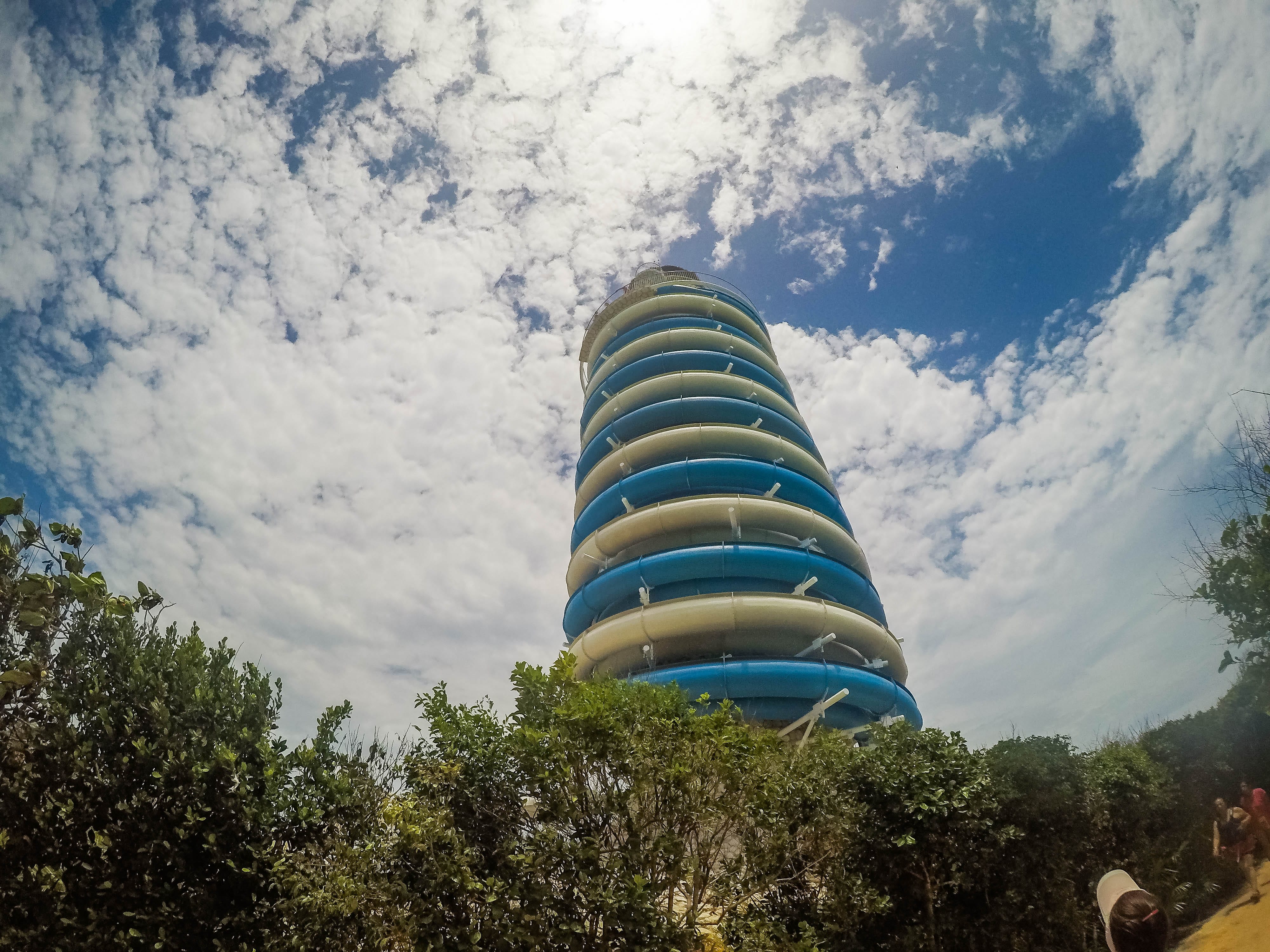 Além disso, a visão de 360 ??graus das alturas permite aos visitantes apreciar mais de 148 hectares de floresta e, claro, o deslumbrante oceano azul. Mas isso não é tudo. O Farol Panorâmico foi projetado para oferecer experiências inesquecíveis a seus visitantes, já que descer das alturas será o mais divertido. Emulando a pintura tradicional dos faróis, em formato de bastão bicolor, o farol do Xel-Há possui um tobogã com quatro canais descendo ao redor do farol, em alta velocidade, para terminar em uma piscina refrescante.